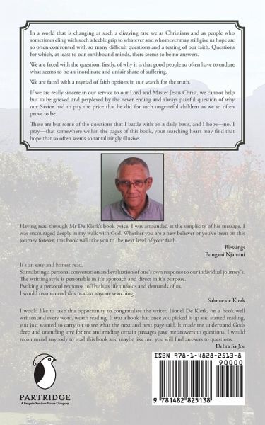 In a world that is changing at such a dizzying rate we as Christians and as people who sometimes cling with such a feeble grip to whatever and whomever may still give us hope are so often confronted with so many difficult questions and a testing of our faith. Questions for which, at least to our earthbound minds, there seems to be no answers. We are faced with the question, firstly, of why it is that good people so often have to endure what seems to be an inordinate and unfair share of suffering. We are faced with a myriad of faith options in our search for the truth. If we are really sincere in our service to our Lord and Master Jesus Christ, we cannot help but to be grieved and perplexed by the never ending and always painful question of why our Savior had to pay the price that he did for such ungrateful children as we so often prove to be. These are but some of the questions that I battle with on a daily basis, and I hope-no, I pray-that somewhere within the pages of this book, your searching heart may find that hope that so often seems so tantalizingly illusive. Having read through Mr De Klerk's book twice, I was astounded at the simplicity of his message. I was encouraged deeply in my walk with God. Whether you are a new believer or you've been on this journey forever, this book will take you to the next level of your faith. Blessings Bongani Njamini It's an easy and honest read. Stimulating a personal conversation and evaluation of one's own response to our individual journey's. The writting style is personable in it's approach and direct in it's purpose. Evoking a personal response to Truth,as life unfolds and demands of us. I would recommend this read,to anyone searching. Salome de Klerk I would like to take this opportunity to congratulate the writer, Lionel De Klerk, on a book well written and every word, worth reading. It was a book that once you picked it up and started reading, you just wanted to carry on to see what the next and next page said. It made me understand Gods deep and unending love for me and reading certain passages gave me answers to questions. I would recommend anybody to read this book and maybe like me, you will find answers to questions. Debra Sa Joe