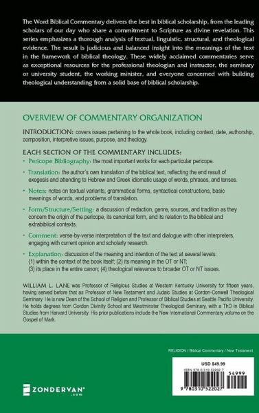 Over 2 million copies sold in The Word Biblical Commentary series. This commentary series delivers the best in biblical scholarship from the leading scholars of our day who share a commitment to Scripture as divine revelation. It emphasizes a thorough analysis of textual, linguistic, structural, and theological evidence, resulting in judicious and balanced insight into the meanings of the text in the framework of biblical theology. These widely acclaimed commentaries serve as exceptional resources for the professional theologian and instructor, the seminary or university student, the working minister, and everyone concerned with building theological understanding from a solid base of biblical scholarship. Overview of Commentary Organization: Introduction--covers issues pertaining to the whole book, including context, date, authorship, composition, interpretive issues, purpose, and theology. Pericope Bibliography--a helpful resource containing the most important works that pertain to each particular pericope. Translation--the author's own translation of the biblical text, reflecting the end result of exegesis and attending to Hebrew and Greek idiomatic usage of words, phrases, and tenses, yet in reasonably good English. Notes--the author's notes to the translation that address any textual variants, grammatical forms, syntactical constructions, basic meanings of words, and problems of translation. Form/Structure/Setting--a discussion of redaction, genre, sources, and tradition as they concern the origin of the pericope, its canonical form, and its relation to the biblical and extra-biblical contexts in order to illuminate the structure and character of the pericope. Rhetorical or compositional features important to understanding the passage are also introduced here. Comment--verse-by-verse interpretation of the text and dialogue with other interpreters, engaging with current opinion and scholarly research. Explanation--brings together all the results of the discussion in previous sections to expose the meaning and intention of the text at several levels: (1) within the context of the book itself; (2) its meaning in the OT or NT; (3) its place in the entire canon; (4) theological relevance to broader OT or NT issues. General Bibliography--occurring at the end of each volume, this extensive bibliography contains all sources used anywhere in the commentary.