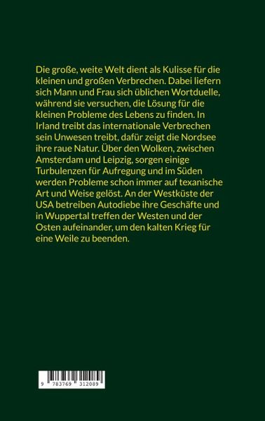 Die große, weite Welt dient wie immer als Kulisse für die kleinen und großen Verbrechen. Dabei liefern sich Mann und Frau sich üblichen Wortduelle, während sie versuchen die Lösung für die kleinen Probleme des Lebens zu finden. In Irland treibt das internationale Verbrechen sein Unwesen treibt, dafür zeigt die Nordsee ihre raue Natur. Über den Wolken, zwischen Amsterdam und Leipzig, sorgen einige Turbulenzen für Aufregung und im Süden werden Probleme schon immer auf texanische Art und Weise gelöst. An der Westküste der USA betreiben Autodiebe ihre Geschäfte und in Wuppertal treffen der Westen und der Osten aufeinander, um den kalten Krieg für eine Weile zu beenden.