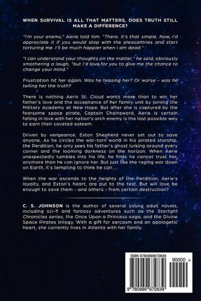 When survival is all that matters, does truth still make a difference? "I'm your enemy," Aerie told him. "There. It's that simple. Now, I'd appreciate it if you would stop with the pleasantries and start torturing me. I'll be much happier when I am dead." "I can understand your thoughts on the matter," he said, obviously smothering a laugh, "but I'd love for you to give me the chance to change your mind." Frustration hit her again. Was he teasing her? Or worse - was he telling her the truth? There is nothing Aeris St. Cloud wants more than to win her father's love and the acceptance of her family unit by joining the Military Academy at New Hope. But after she is captured by the fearsome space pirate, Captain Chainsword, Aerie is certain falling in love with her nation's arch enemy is the last possible way to earn their coveted esteem. Driven by vengeance, Exton Shepherd never set out to save anyone. As he circles the war-torn world in his pirated starship, the Perdition, he only sees his father's ghost lurking around every corner and the looming darkness on the horizon. When Aerie unexpectedly tumbles into his life, he finds he cannot trust her, anymore than he can ignore her. But just like the raging war down on Earth, it's tempting to think he can ... When the war ascends to the heights of the Perdition, Aerie's loyalty, and Exton's heart, are put to the test. But will love be enough to save them - and others - from certain destruction?The Heights of Perdition is the first book in the Divine Space Pirates trilogy, a futuristic romance series where family, faith, and freedom are all at risk. Look for Book 2, The Breadth of Creation, as the story - and the war - continues on!