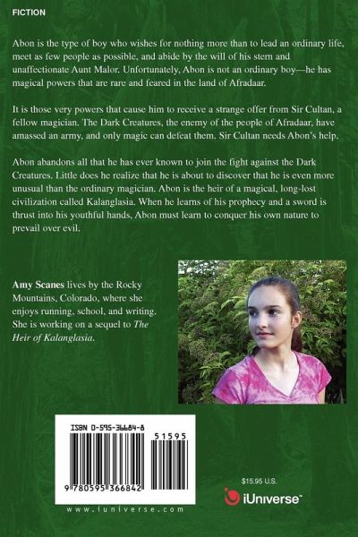 Abon is the type of boy who wishes for nothing more than to lead an ordinary life, meet as few people as possible, and abide by the will of his stern and unaffectionate Aunt Malor. Unfortunately, Abon is not an ordinary boy-he has magical powers that are rare and feared in the land of Afradaar. It is those very powers that cause him to receive a strange offer from Sir Cultan, a fellow magician. The Dark Creatures, the enemy of the people of Afradaar, have amassed an army, and only magic can defeat them. Sir Cultan needs Abon's help. Abon abandons all that he has ever known to join the fight against the Dark Creatures. Little does he realize that he is about to discover that he is even more unusual than the ordinary magician. Abon is the heir of a magical, long-lost civilization called Kalanglasia. When he learns of his prophecy and a sword is thrust into his youthful hands, Abon must learn to conquer his own nature to prevail over evil.