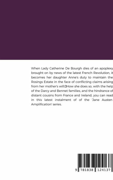 When Lady Catherine De Bourgh dies of an apoplexy brought on by news of the latest French Revolution, it becomes her daughter Anne's duty to maintain the Rosings Estate in the face of conflicting claims arising from her mother's will. How she does so, with the help of the Darcy and Bennet families, and the hindrance of distant cousins from France and Ireland, you can read in this latest instalment of of the 'Jane Austen Amplification' series.