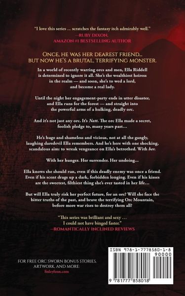Once, he was her dearest friend... but now he's a brutal, terrifying monster. In a world of recently warring orcs and men, Ella Riddell is determined to ignore it all. She's the wealthiest heiress in the realm -- and soon, she's to wed a lord, and become a real lady. Until the night her engagement-party ends in utter disaster, and Ella runs for the forest -- and straight into the powerful arms of a hulking, deadly orc. And it's not just any orc. It's Natt. The orc Ella made a secret, foolish pledge to, many years past... He's huge and shameless and vicious, not at all the gangly, laughing daredevil Ella remembers. And he's here with one shocking, scandalous aim: to wreak vengeance on Ella's betrothed. With her. With her hunger. Her surrender. Her undoing... Ella knows she should run, even if this deadly enemy was once a friend. Even if his scent drags up a dark, forbidden longing. Even if his kisses are the sweetest, filthiest thing she's ever tasted in her life... But will Ella truly risk her perfect future, for an orc? Will she face the bitter truths of the past, and brave the terrifying Orc Mountain, before more war rises to destroy them all? ______ Paperback edition also includes a bonus epilogue!¿