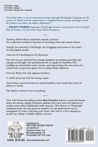 Attorney Shawn Rossi could have earned a fortune. He could have worked at big firms in booming cities and sunnier climes. Instead, he returned to Pittsburgh, the struggling steel town of his youth -- to help regular people. And now he's doubting his life decisions. His wife has just died and his teenage daughters are getting piercings and staying out all night. His professional life is equally in shambles: He's handling an unwinnable estate contest and representing the one person he vowed never to get near again: his ex-college flame, Marjorie. Even for Rossi, this case appears hopeless. A coffin shows up with the wrong corpse. Nuns from a secretive home for unwed mothers can't break their vows of silence to testify. The family is about to lose everything. New York Times bestselling author Ken Gormley delivers a powerful drama about the decent, largely-forgotten qualities that once were the bedrock of simple towns whose inhabitants built America. The Heiress of Pittsburgh reawakens hope that the precious qualities of past generations can be reimagined to create a dazzling new future. But only if a few courageous people are willing to boldly redefine success.