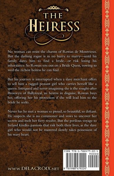 No woman can resist the charms of Rowan de Montvieux. But the dashing rogue is in no hurry to marry-until his family dares him to find a bride…or risk losing his inheritance. So Rowan sets out on a Bride Quest, vowing to wed only The Heiress. But his journey is interrupted when a slave merchant offers to sell him a ragged peasant girl who carries herself like a queen. Intrigued and never imagining she is the sought-after Bronwyn of Ballyroyal, an heiress in disguise, Rowan buys her, offering her his protection if she will lead him to the bride he seeks. Never has he met a woman so proud, so beautiful, so defiant. He suspects she is no commoner and vows to uncover her secrets and melt her fiery resolve. But the perilous voyage to Ireland kindles passions that risk both their lives, as the slave girl who would not be mastered slowly takes possession of his wary heart.