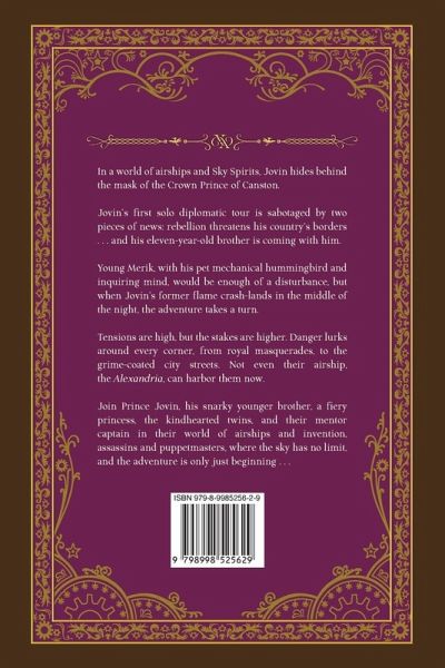 In a world of airships and Sky Spirits, Jovin hides behind the mask of the Crown Prince of Canston. Jovin's first solo diplomatic tour is sabotaged by two pieces of news: rebellion threatens his country's borders... and his eleven-year-old brother is coming with him. Young Merik, with his pet mechanical hummingbird and inquiring mind, would be enough of a disturbance, but when Jovin's former flame crash-lands in the middle of the night, the adventure takes a turn. Tensions are high, but the stakes are higher. Danger lurks around every corner, from royal masquerades, to the grime-coated city streets. Not even their airship, the Alexandria, can harbor them now. Join Prince Jovin, his snarky younger brother, a fiery princess, the kindhearted twins, and their mentor captain in their world of airships and invention, assassins and puppetmasters, where the sky has no limit, and the adventure is only just beginning...