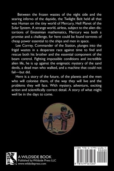 Between the frozen wastes of the night side and the searing inferno of the dayside, the Twilight Belt held all that was Human on the tiny world of Mercury, Hell Planet of the Solar System. A strange world, airless, subject to the alien distortions of Einsteinian mathematics, Mercury was both a promise and a challenge, for here could be found torrents of cheap power essential to the ships and men in space. Lee Correy, Commander of the Station, plunges into the frigid wastes in a desperate race against time to find and rescue both his brother and the essential component of the beam control. Fighting impossible conditions and incredible alien life, he is up against the enigmatic mystery of the sand devils, a dead man who walked, and a machine that could not fail-but did. Here is a story of the future, of the planets and the men who will colonise them, of the way they will live and the problems they will face. With mystery, adventure, exciting action and scientifically correct detail. A story of what might well be in the days to come.