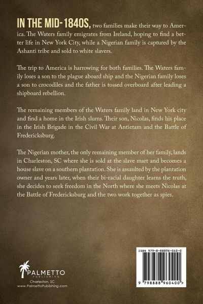 IN THE MID-1840S, two families make their way to America. The Waters family emigrates from Ireland, hoping to find a better life in New York City. Meanwhile, in Nigeria, a family is captured by hostile parties and sold to white slavers. At the end of the slavers' harrowing journey across the Atlantic Ocean, Mowori, the surviving member of the family, is sold to a South Carolina plantation owner. Nicolas Waters, the youngest son of the Waters clan, struggles to find respect, acceptance, and purpose. He finds a home in the U.S. Army as a member of the 3rdIrish Brigade shortly before the breakout of the Civil War and distinguishes himself at the Battle of Antietam. His reward is selection for a special mission, as a spy, at the forthcoming Battle of Fredericksburg. Eliza, Mowori's daughter, learns that her mother was the victim of rape by her father and leaves her home to seek freedom in the North. Her journey ends in Fredericksburg, VA, where she finds refuge in a house of ill repute run by a female Union Army spy. Gifted with total recall, Eliza becomes a runner for the spy network and meets Nicolas. Nicolas and Eliza work together as spies as the armies move into place. When the battle is at its zenith, Nicolas returns to his unit and is severely wounded. As the fighting ends, the Union Army recognizes the two as heroes. They fall in love and return to Nicolas' home, where they are married.
