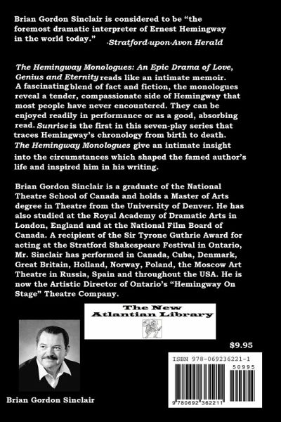Brian Gordon Sinclair is considered to be "the foremost dramatic interpreter of Ernest Hemingway in the world today." -Stratford-upon-Avon Herald, UK The Hemingway Monologues: An Epic Drama of Love, Genius and Eternity reads like an intimate memoir. A fascinating blend of fact and fiction, the monologues reveal a tender, compassionate side of Hemingway that most people have never encountered. They can be enjoyed readily in performance or as a good, absorbing read. Sunrise is the first in this seven-play series that traces Hemingway's chronology from birth to death.. The Hemingway Monologues give an intimate insight into the circumstances which shaped the famed author's life and inspired him in his writing.