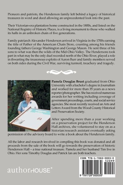Pioneers and patriots, the Henderson family left behind a legacy of historical treasures in word and deed, allowing an unprecedented look into the past. Their Victorian-era plantation home, constructed in the 1800s and listed on the National Register of Historic Places, is a living monument to those who walked its halls in an unbroken chain of five generations. Family patriarch Alexander Henderson arrived in Virginia in the 1700s, earning the title of Father of the American Chain Store, counting founding fathers George Washington and George Mason among his friends. He sent three of his sons to what was then the wilds of the Mid-Ohio Valley. The Hendersons took part in what may be the only duel recorded north of the Ohio River and played a role in thwarting the treasonous exploits of Aaron Burr. Some family members also served on both sides during the Civil War, surviving turmoil, treachery, and tragedy.