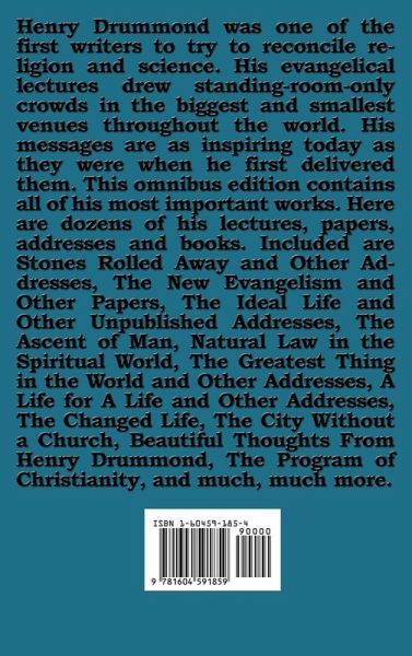 Henry Drummond was one of the first writers to try to reconcile religion and science. His evangelical lectures drew standing-room-only crowds in the biggest and smallest venues throughout the world. His messages are as inspiring today as they were when he first delivered them. This omnibus edition contains all of his most important works. Here are dozens of his lectures, papers, addresses and books. Included are Stones Rolled Away and Other Addresses, The New Evangelism and Other Papers, The Ideal Life and Other Unpublished Addresses, The Ascent of Man, Natural Law in the Spiritual World, The Greatest Thing in the World and Other Addresses, A Life for A Life and Other Addresses, The Changed Life, The City Without a Church, Beautiful Thoughts From Henry Drummond, The Program of Christianity, and much, much more.