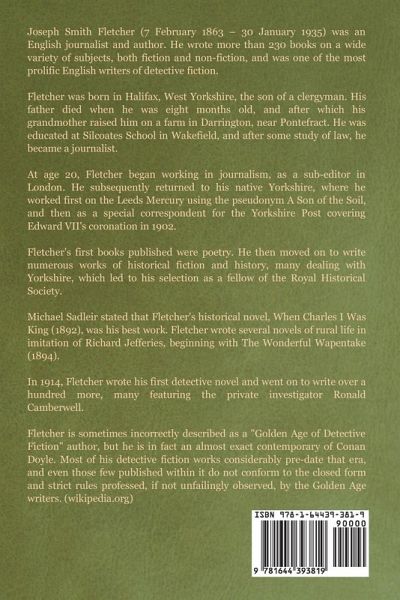 Joseph Smith Fletcher (7 February 1863 - 30 January 1935) was an English journalist and author. He wrote more than 230 books on a wide variety of subjects, both fiction and non-fiction, and was one of the most prolific English writers of detective fiction. Fletcher was born in Halifax, West Yorkshire, the son of a clergyman. His father died when he was eight months old, and after which his grandmother raised him on a farm in Darrington, near Pontefract. He was educated at Silcoates School in Wakefield, and after some study of law, he became a journalist. At age 20, Fletcher began working in journalism, as a sub-editor in London. He subsequently returned to his native Yorkshire, where he worked first on the Leeds Mercury using the pseudonym A Son of the Soil, and then as a special correspondent for the Yorkshire Post covering Edward VII's coronation in 1902. Fletcher's first books published were poetry. He then moved on to write numerous works of historical fiction and history, many dealing with Yorkshire, which led to his selection as a fellow of the Royal Historical Society. Michael Sadleir stated that Fletcher's historical novel, When Charles I Was King (1892), was his best work. Fletcher wrote several novels of rural life in imitation of Richard Jefferies, beginning with The Wonderful Wapentake (1894). In 1914, Fletcher wrote his first detective novel and went on to write over a hundred more, many featuring the private investigator Ronald Camberwell. Fletcher is sometimes incorrectly described as a "Golden Age of Detective Fiction" author, but he is in fact an almost exact contemporary of Conan Doyle. Most of his detective fiction works considerably pre-date that era, and even those few published within it do not conform to the closed form and strict rules professed, if not unfailingly observed, by the Golden Age writers. (wikipedia.org)