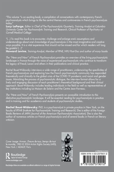 "The "Here and Now" of French Psychoanalysis, Conversations with Contemporary French Psychoanalysts is an exciting book, a compilation of conversations with contemporary French psychoanalysts which brings to life the central themes and controversies in French psychoanalysis today. Dr. Boué-Widawsky's thoughtful interviews make French psychoanalysis accessible to the Anglophone reader. Although it would be possible to use the book as a reference to learn about a specific author, my sense is that readers will be stimulated, as I was, to read it through and to engage with the lively and erudite conversations that it presents. The book is a pleasure to read as well as a useful introduction to French psychoanalysis." - Lucy LaFarge, M.D.; Editor in Chief, The Psychoanalytic Quarterly, Training Analyst at Columbia University Center for Psychoanalytic Training and Research, Clinical Professor of Psychiatry at Cornell Medical College.