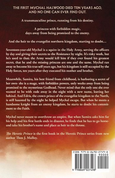 The first Mychal Halwood died ten years ago, and no one can ever find out. A transmasculine prince, running from his destiny. A princess with forbidden magic, days away from being promised to the enemy. And the heir to the evangelist northern kingdom, starting to doubt... Seventeen-year-old Mychal is a squire in the Holy Army, serving the officers by day and giving their secrets to the Resistance by night. It's risky work, but he's used to that; the Army would kill him if they ever found his greatest secret, that he and the missing princess are one and the same. Mychal ran away to become his true self years ago, but his kingdom is still occupied by the Holy forces, ten years after they executed his mother and brother. Meanwhile, Samira, his best friend from childhood, is harboring a secret of her own- she is a mage, with forbidden powers, only weeks away from being promised to the mysterious Godhead. Never mind that the only one she ever wanted to be with rode away in the night with a new name, leaving her behind. And Edris, the crown prince of the evangelist kingdom to the North, is still haunted by the night he helped Mychal escape. But when he meets a handsome knight from an enemy kingdom, he starts to doubt his commitment to the Faith. Mychal never meant to overthrow an empire. But when Samira asks him for his help and his first battle ends in disaster, he finds that he has to go home- and take his brother's name and place as heir to the throne. The Heretic Prince is the first book in the Heretic Prince series from new author Theo J. Malloy.