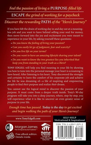There is nothing more unmotivating than working just for a paycheck and believing money and materialism will bring happiness, or selling your soul for what we have been taught to believe will make us happy. How do you know if you're living your purpose? When you're living your purpose, you are motivated, grateful, inspired, joyful, peaceful, and experience abundance. The complete opposite of this is just surviving and doing what everyone else is doing. Everyone wants to be a Hero and share their calling to make the world a better place. Everyone wants to feel passion in life. The challenge is to find the gift buried below all the societal conditioning we have absorbed in our life and what we are told will bring us joy. You can find that spark of divinity and empowerment inside of you. Anyone committed to embracing and applying the practical tools in The Hero Inside You can change the way they feel, find their calling, thrive and fall in love with life. The Hero Inside You teaches you how to find your purpose buried deep inside the heart; you cannot use the logical mind the way most people think and believe to discover this purpose. . .this calling. Learn how take the Hero's journey and live the life you were meant to live and be the true you---a Hero.