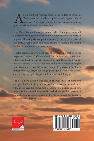 An all night convenience store in the middle of nowhere. Two women hurt and held captive by a strung out, twisted criminal. A stranger minding his own business, showing up in the wrong place at the wrong time. Ray Porter is an ordinary guy whose sheltered and peaceful world is shattered one night when he stumbles upon an armed robbery in progress. Resisting the temptation to not get involved, he instead uses gritty determination and fierce resolve to overtake the violent psychopath and rescue the two captives. Porter becomes an overnight hero of legendary proportion in the sleepy, rural town of Willow Creek and is bestowed astonishing tribute and bounty. But the intensely private Porter soon realizes that such revered status isn't for him, and a hasty retreat to simpler times becomes an eventful journey sculpted by those in his life: a protective sister, a bright but clinging teenager, a kindhearted sheriff, and a strange and puzzling victim from that fateful night. This is a novel about a true dyed in the wool hero, an unknown who puts his life in jeopardy for total strangers, and who does so without the need for recognition or glory. It is a story about how private worlds can suddenly collide with the unyielding powers of fate and circumstance, resulting in lives being altered for better or worse, or even swept away.