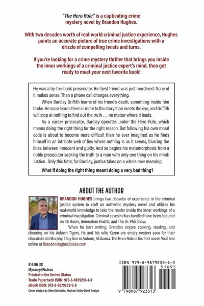 What if doing the right thing meant doing a very bad thing?It's after midnight and Duncan Pheiffer sits alone in a darkened courtroom in Towne, Alabama, heavy with the burden of a verdict that has his client facing a death sentence. While he understands many of his clients are guilty, he's certain Charlie Calvin Clements is not. And Duncan vows to continue fighting until he proves Charlie's innocence. But any hope of exoneration ends abruptly mere hours after the jury's verdict. Was it a random act of violence or something more sinister?When prosecutor Barclay Griffith inserts himself into the case, he soon raises questions about Clements' conviction-a conviction that investigators prefer to remain undisturbed.Barclay operates under the Hero Rule, which means doing the right thing for the right reason. But following his own moral code is about to become more difficult than he ever imagined as he finds himself in an intricate web of lies where nothing is as it seems-blurring the lines between innocent and guilty. And so begins his metamorphosis from a noble prosecutor seeking the truth to a man with only one thing on his mind: Justice.Only this time, justice takes on a whole new meaning.What makes a hero? Is it doing the right thing...at any cost? Barclay Griffith is about to find out the hard way."The Hero Rule" is a captivating crime mystery novel by Brandon Hughes.With two decades worth of real-world criminal justice experience, Hughes paints a picture of true crime investigations with a drizzle of compelling twists and turns sure to please the true crime enthusiast.If you're looking for a crime mystery legal thriller that brings you inside the inner workings of a criminal justice expert's mind, then get ready to meet your next favorite book!