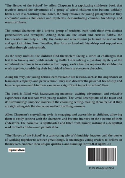 "The Heroes of the School" by Allen Chapman is a captivating children's book that revolves around the adventures of a group of school children who become unlikely heroes. Set in a charming small town, the story follows the young protagonists as they encounter various challenges and mysteries, demonstrating courage, friendship, and resourcefulness. The central characters are a diverse group of students, each with their own distinct personalities and strengths. Among them are the smart and curious Bobby, the kind-hearted and helpful Betty, the daring and adventurous Jack, and the resourceful and quick-thinking Tom. Together, they form a close-knit friendship and support one another through various trials. As the story unfolds, the children find themselves facing a series of challenges that test their bravery and problem-solving skills. From solving a puzzling mystery at the old abandoned house to rescuing a lost puppy, each situation requires the children to work together, combining their individual talents to overcome obstacles. Along the way, the young heroes learn valuable life lessons, such as the importance of teamwork, empathy, and perseverance. They also discover the power of friendship and how compassion and kindness can make a significant impact on others' lives. The book is filled with heartwarming moments, exciting adventures, and relatable experiences that resonate with young readers. The vivid descriptions of the town and its surroundings immerse readers in the charming setting, making them feel as if they are right alongside the characters on their thrilling journeys. Allen Chapman's storytelling style is engaging and accessible to children, allowing them to easily connect with the characters and become invested in the outcome of their endeavors. The narrative is lighthearted and filled with humor, making it a delightful read for both children and parents alike. "The Heroes of the School" is a captivating tale of friendship, bravery, and the power of working together to achieve great things. It encourages young readers to believe in themselves, embrace their unique qualities, and stand up for what is right."