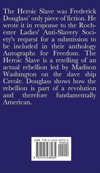 The Heroic Slave was Frederick Douglass' only piece of fiction. He wrote it in response to the Rochester Ladies' Anti-Slavery Society's request for a submission to be included in their anthology Autographs for Freedom. The Heroic Slave is a retelling of an actual rebellion led by Madison Washington on the slave ship Creole. Douglass shows how the rebellion is part of a revolution and therefore fundamentally American.