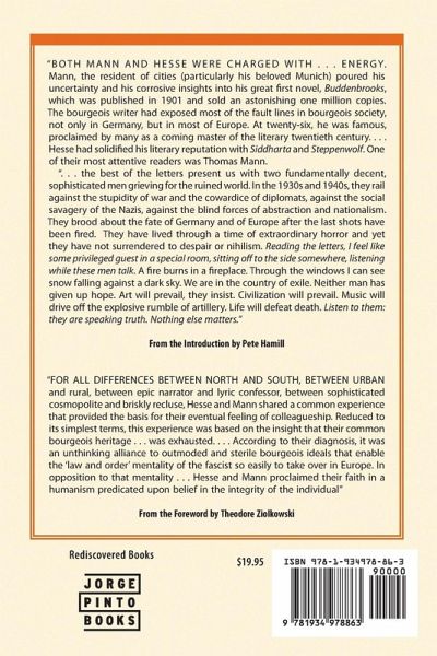 "Both Mann and Hesse were charged with … energy. Mann, the resident of cities (particularly his beloved Munich) poured his uncertainty and his corrosive insights into his great first novel, Buddenbrooks, which was published in 1901 and sold an astonishing one million copies. The bourgeois writer had exposed most of the fault lines in bourgeois society, not only in Germany, but in most of Europe. At twenty-six, he was famous, proclaimed by many as a coming master of the literary twentieth century…., Hesse had solidified his literary reputation with Siddharta and Steppenwolf. One of their most attentive readers was Thomas Mann. . .. the best of the letters present us with two fundamentally decent, sophisticated men grieving for the ruined world. In the 1930s and 1940s, they rail against the stupidity of war and the cowardice of diplomats, against the social savagery of the Nazis, against the blind forces of abstraction and nationalism. They brood about the fate of Germany and of Europe after the last shots have been fired. They have lived through a time of extraordinary horror and yet they have not surrendered to despair or nihilism. Reading the letters, I feel like some privileged guest in a special room, sitting off to the side somewhere, listening while these men talk. A fire burns in a fireplace. Through the windows I can see snow falling against a dark sky. We are in the country of exile. Neither man has given up hope. Art will prevail, they insist. Civilization will prevail. Music will drive off the explosive rumble of artillery. Life will defeat death. Listen to them: they are speaking truth. Nothing else matters. " From the Introduction by Pete Hamill "For all differences between north and south, between urban and rural, between epic narrator and lyric confessor, between sophisticated cosmopolite and briskly recluse, Hesse and Mann shared a common experience that provided the basis for their eventual feeling of colleagueship. Reduced to its simplest terms, this experience was based on the insight that their common bourgeois heritage….was exhausted…. According to their diagnosis, it was an unthinking alliance to outmoded and sterile bourgeois ideals that enable the "law and order" mentality of the fascist so easily to take over in Europe. In opposition to that mentality ..Hesse and Mann proclaimed their faith in a humanism predicated upon belief in the integrity of the individual" From the Foreword by Theodore Ziolkowski