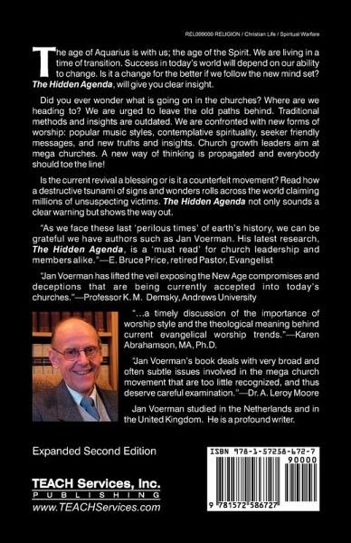 The age of Aquarius is with us; the age of the Spirit. We are living in a time of transition. Success in today's world will depend on our ability to change. Is it a change for the better if we follow the new mind set? The Hidden Agenda will give you clear insight. Did you ever wonder what is going on in the churches? Where are we heading to? We are urged to leave the old paths behind. Traditional methods and insights are outdated. We are confronted with new forms of worship: popular music styles, contemplative spirituality, seeker friendly messages, and new truths and insights. Church growth leaders aim at mega churches. A new way of thinking is propagated and everybody should toe the line! Is the current revival a blessing or is it a counterfeit movement? Read how a destructive tsunami of signs and wonders rolls across the world claiming millions of unsuspecting victims. The Hidden Agenda not only sounds a clear warning but shows the way out. "As we face these last 'perilous times' of earth's history, we can be grateful we have authors such as Jan Voerman. His latest research, The Hidden Agenda, is a 'must read' for church leadership and members alike." -E. Bruce Price, retired Pastor, Evangelist "Jan Voerman has lifted the veil exposing the New Age compromises and deceptions that are being currently accepted into today's churches."-Professor K. M Demsky, Andrews University "...a timely discussion of the importance of worship style and the theological meaning behind current evangelical worship trends."-Karen Abrahamson, MA, Ph. D. "Jan Voerman's book deals with very broad and often subtle issues involved in the mega church movement that are too little recognized, and thus deserve careful examination."-Dr. A. Leroy Moore Jan Voerman studied in the Netherlands and the United Kingdom. He is a profound writer.