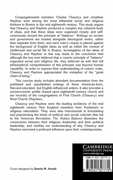 Congregationalist ministers Charles Chauncy and Jonathan Mayhew were among the most influential social and religious thinkers in Boston in the mid-eighteenth century. This 1987 study argues that Chauncy and Mayhew produced a complex but coherent body of ideas and that these ideas were organized closely and self-consciously around the principle of 'balance'. Writings on society and government are treated alongside theological works, rather than separate from them, and each man's corpus is placed against the background of English ideas as well as within the context of intellectual and social life in Boston. Investigation of the ideas of Chauncy and Mayhew in this way leads to the conclusion that although the two men believed that a cosmic principle of 'balance' organized social and religious life, they believed as well that full philosophical comprehension of this principle was beyond human capability. In order to express their understanding of cosmic order, Chauncy and Mayhew appropriated the metaphor of the 'great chain of being'.