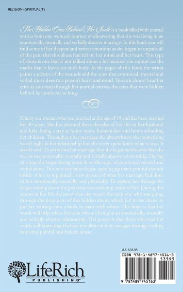 The Hidden Cries Behind Her Smile is a book filled with journal entries from one woman's journey of discovering that she was living in an emotionally, mentally and verbally abusive marriage. In this book you will find some of her deepest and rawest emotions as she began to unpack all of the pain that this abuse had left on her mind and her heart. This type of abuse is one that is not talked about a lot because you cannot see the marks that it leaves on one's body. In the pages of this book the writer paints a picture of the wounds and the scars that emotional, mental and verbal abuse does to a person's heart and mind. You can almost hear her cries as you read through her journal entries, the cries that were hidden behind her smile for so long.