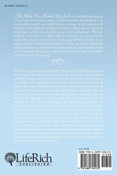 The Hidden Cries Behind Her Smile is a book filled with journal entries from one woman's journey of discovering that she was living in an emotionally, mentally and verbally abusive marriage. In this book you will find some of her deepest and rawest emotions as she began to unpack all of the pain that this abuse had left on her mind and her heart. This type of abuse is one that is not talked about a lot because you cannot see the marks that it leaves on one's body. In the pages of this book the writer paints a picture of the wounds and the scars that emotional, mental and verbal abuse does to a…mehr