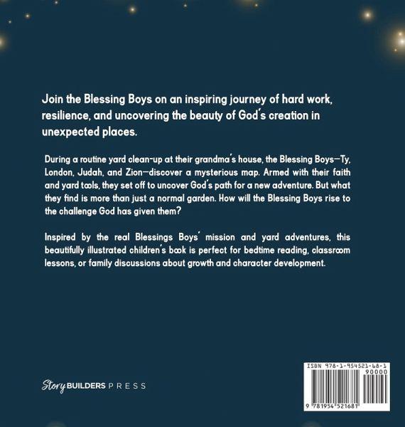 Join the Blessing Boys on an inspiring journey of hard work, resilience, and uncovering the beauty of God's creation in unexpected places. During a routine yard clean-up at their grandma's house, the Blessing Boys--Ty, London, Judah, and Zion--discover a mysterious map. Armed with their faith and yard tools, they set off to uncover God's path for a new adventure. But what they find is more than just a normal garden. How will the Blessing Boys rise to the challenge God has given them? Inspired by the real Blessing Boys' mission and yard adventures, this beautifully illustrated children's book is perfect for bedtime reading, classroom lessons, or family discussions about growth and character development.