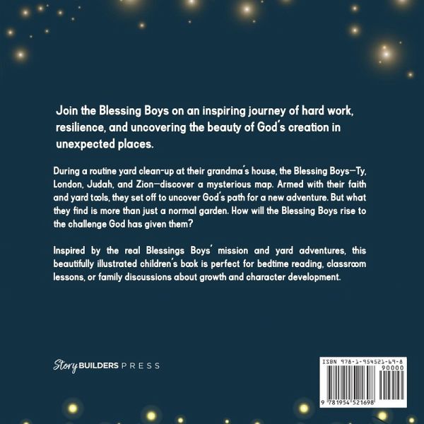 Join the Blessing Boys on an inspiring journey of hard work, resilience, and uncovering the beauty of God's creation in unexpected places. During a routine yard clean-up at their grandma's house, the Blessing Boys--Ty, London, Judah, and Zion--discover a mysterious map. Armed with their faith and yard tools, they set off to uncover God's path for a new adventure. But what they find is more than just a normal garden. How will the Blessing Boys rise to the challenge God has given them? Inspired by the real Blessing Boys' mission and yard adventures, this beautifully illustrated children's book is perfect for bedtime reading, classroom lessons, or family discussions about growth and character development.