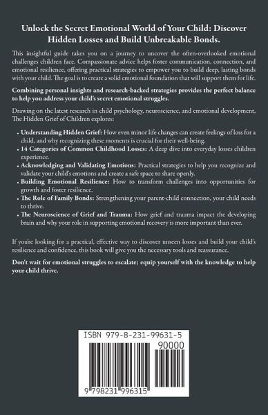 Unlock the Secret Emotional World of Your Child: Discover Hidden Losses and Build Unbreakable Bonds. This insightful guide takes you on a journey to uncover the often-overlooked emotional challenges children face. Compassionate advice helps foster communication, connection, and emotional resilience, offering practical strategies to empower you to build deep, lasting bonds with your child. The goal is to create a solid emotional foundation that will support them for life. Combining personal insights and research-backed strategies provides the perfect balance to help you address your child's secret emotional struggles. Drawing on the latest research in child psychology, neuroscience, and emotional development, The Hidden Grief of Children explores:Understanding Hidden Grief: How even minor life changes can create feelings of loss for a child, and why recognizing these moments is crucial for their well-being. 14 Categories of Common Childhood Losses: A deep dive into everyday losses children experience. Acknowledging and Validating Emotions: Practical strategies to help you recognize and validate your child's emotions and create a safe space to share openly. Building Emotional Resilience: How to transform challenges into opportunities for growth and foster resilience. The Role of Family Bonds: Strengthening your parent-child connection your child needs to thrive. The Neuroscience of Grief and Trauma: How grief and trauma impact the developing brain and why your role in supporting emotional recovery is more important than ever. If you're looking for a practical, effective way to discover unseen losses and build your child's resilience and confidence, this book will give you the necessary tools and reassurance. Don't wait for emotional struggles to escalate; equip yourself with the knowledge to help your child thrive. Ready to make a lasting impact on your child's life? Click the buy button to begin your journey today! See you inside!