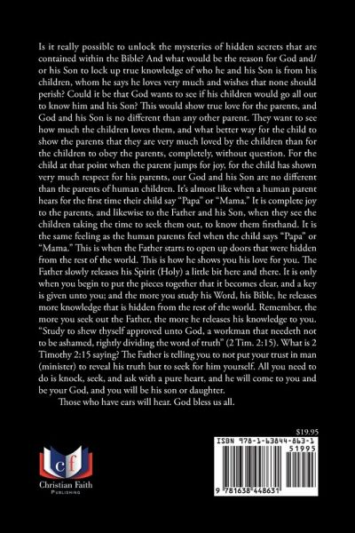 Is it really possible to unlock the mysteries of hidden secrets that are contained within the Bible? And what would be the reason for God and/or his Son to lock up true knowledge of who he and his Son is from his children, whom he says he loves very much and wishes that none should perish? Could it be that God wants to see if his children would go all out to know him and his Son? This would show true love for the parents, and God and his Son is no different than any other parent. They want to see how much the children loves them, and what better way for the child to show the parents that they are very much loved by the children than for the children to obey the parents, completely, without question. For the child at that point when the parent jumps for joy, for the child has shown very much respect for his parents, our God and his Son are no different than the parents of human children. It's almost like when a human parent hears for the first time their child say "Papa" or "Mama." It is complete joy to the parents, and likewise to the Father and his Son, when they see the children taking the time to seek them out, to know them firsthand. It is the same feeling as the human parents feel when the child says "Papa" or "Mama." This is when the Father starts to open up doors that were hidden from the rest of the world. This is how he shows you his love for you. The Father slowly releases his Spirit (Holy) a little bit here and there. It is only when you begin to put the pieces together that it becomes clear, and a key is given unto you; and the more you study his Word, his Bible, he releases more knowledge that is hidden from the rest of the world. Remember, the more you seek out the Father, the more he releases his knowledge to you. "Study to shew thyself approved unto God, a workman that needeth not to be ashamed, rightly dividing the word of truth" (2 Tim. 2:15). What is 2 Timothy 2:15 saying? The Father is telling you to not put your trust in man (minister) to reveal his truth but to seek for him yourself. All you need to do is knock, seek, and ask with a pure heart, and he will come to you and be your God, and you will be his son or daughter. Those who have ears will hear. God bless us all.
