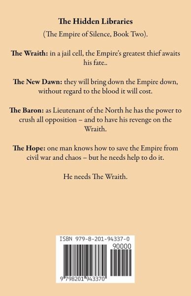 The Hidden Libraries (The Empire of Silence, Book Two). The Wraith: in a jail cell, the Empire's greatest thief awaits his fate.. The New Dawn: they will bring down the Empire down, without regard to the blood it will cost. The Baron: as Lieutenant of the North he has the power to crush all opposition – and to have his revenge on the Wraith. The Hope: one man knows how to save the Empire from civil war and chaos – but he needs help to do it. He needs The Wraith. 137,000 words (approx).