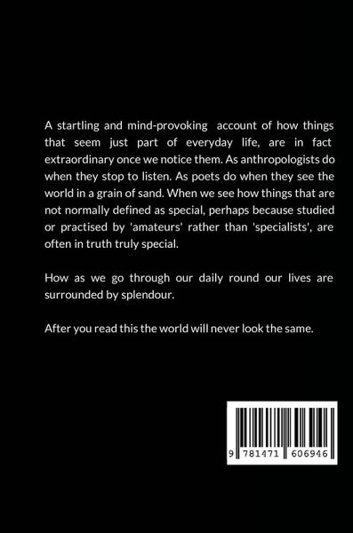 A startling and mind-provoking account of how things that seem just part of everyday life, are in fact extraordinary once we notice them. As anthropologists do when they stop to listen. As poets do when they see the world in a grain of sand. When we see how things that are not normally defined as special, perhaps because studied or practised by 'amateurs' rather than 'specialists', are often in truth truly special. How as we go through our daily round our lives are surrounded by splendour. After you read this the world will never look the same.