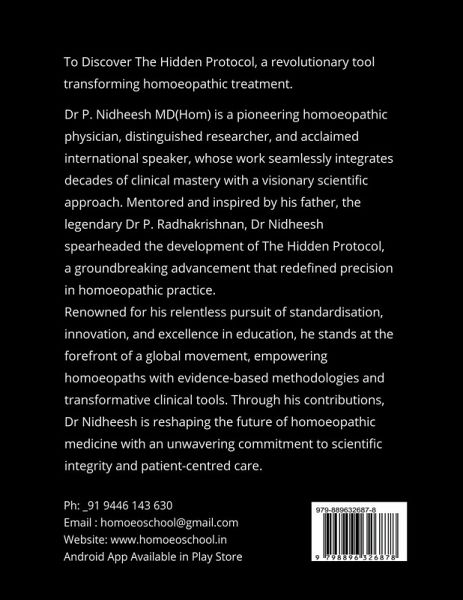 Discover The Hidden Protocol, a revolutionary tool transforming homoeopathic treatment. Developed by Dr P. Nidheesh, inspired by the legendary Dr P. Radhakrishnan, this system standardises treatment plans with precision and clarity. Combining decades of experience and cutting-edge research, it empowers homoeopaths worldwide to deliver consistent, evidence-based care for all patients.