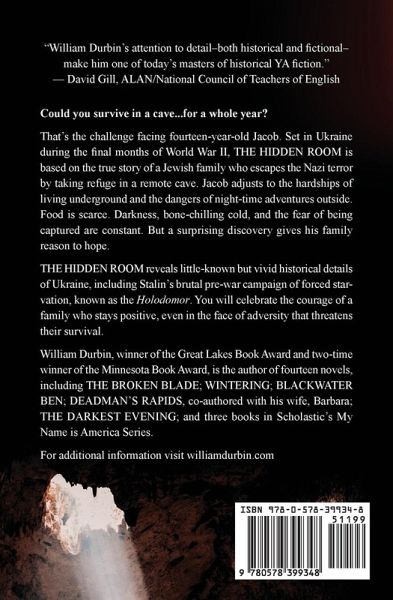 Could you survive in a cave...for a whole year? That's the challenge facing fourteen-year-old Jacob. Set in Ukraine during the final months of World War II, THE HIDDEN ROOM is based on the true story of a Jewish family who escapes from the Nazis by taking refuge in a remote cave. Jacob adjusts to the hardships of living underground and the dangers of night-time adventures outside the cave. Food is scarce. Darkness, bone-chilling cold, and the fear of being captured are constant. But a surprising discovery gives his family reason to hope. Bringing young readers back to this time of terror, THE HIDDEN ROOM reveals little-known but vivid historical details of Ukraine, including Stalin's brutal pre-war campaign of forced starvation, known as the Holodomor. You will celebrate the courage of a family who stays positive, even in the face of adversity that threatens their survival. William Durbin, winner of the Great Lakes Book Award and two Minnesota Book Awards, is the author of fourteen historical novels, including THE BROKEN BLADE; WINTERING; BLACKWATER BEN; DEADMAN'S RAPIDS, co-authored with his wife, Barbara; THE DARKEST EVENING; and three books in Scholastic's My Name is America Series. For additional information visit williamdurbin.com