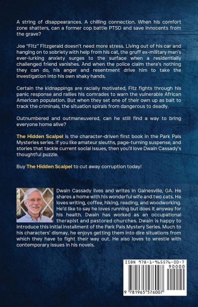 A string of disappearances. A chilling connection. When his comfort zone shatters, can a former cop battle PTSD and save innocents from the grave? Joe "Fitz" Fitzgerald doesn't need more stress. Living out of his car and hanging on to sobriety with help from his cat, the gruff ex-military man's ever-lurking anxiety surges to the surface when a residentially challenged friend vanishes. And when the police claim there's nothing they can do, his anger and resentment drive him to take the investigation into his own shaky hands. Certain the kidnappings are racially motivated, Fitz fights through his panic response and rallies his comrades to warn the vulnerable African American population. But when they set one of their own up as bait to track the criminals, the situation spirals from dangerous to deadly. Outnumbered and outmaneuvered, can he still find a way to bring everyone home alive? The Hidden Scalpel is the character-driven first book in the Park Pals Mysteries series. If you like amateur sleuths, page-turning suspense, and stories that tackle current social issues, then you'll love Dwain Cassady's thoughtful puzzle. Buy The Hidden Scalpel to cut away corruption today!