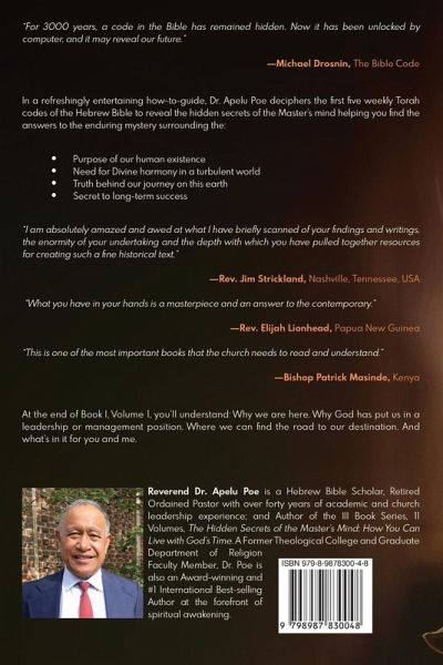 The Hidden Secrets of the Master's Mind: How You Can Live with God's Time serves as an introductory pathway into spiritual teachings of the Torah and analyzes weekly Torah portions using expert Biblical linguistics techniques, while also using Hebrew to understand the hidden meanings behind Biblical teachings to help people fulfill their purpose. The Hidden Secrets of the Master's Mind is the first installment in Dr. Apelu Poe's new 3-part series of books. With the 3-part series containing 11 volumes in total, the purpose of this series is to help people from all walks of life enhance their divine connection, understand how the universe works for them, and become the person that God has intended them to be. Over the course of 11 volumes, Dr. Poe analyzes the 54 weekly Torah portions to help readers understand the hidden meaning behind each portion while also helping readers truly absorb the essence of these Biblical teachings for practical implementation in daily living. While the first book focuses on human creation, the entire series answers an array of important spiritual questions. From decoding God's theological message to offering decades' worth of knowledge in this series, Dr. Poe is sharing essential educational resources to help people enhance their divine connection.