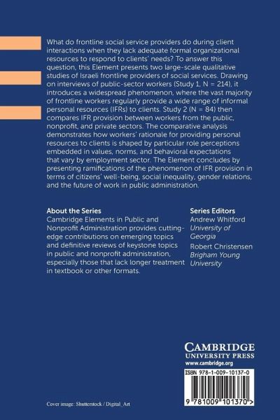 What do frontline social service providers do during client interactions when they lack adequate formal organizational resources to respond to clients' needs? To answer this question, this Element presents two large-scale qualitative studies of Israeli frontline providers of social services.