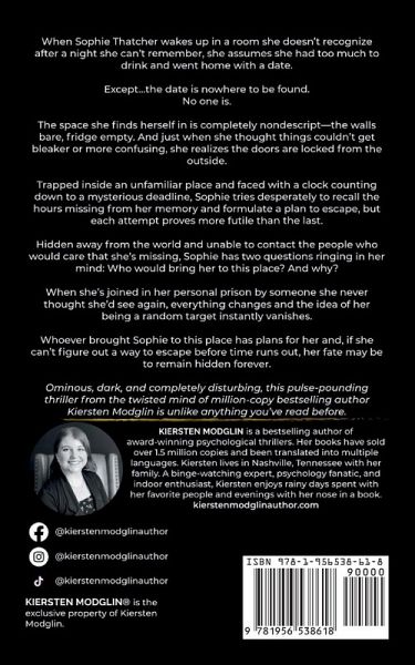 When Sophie Thatcher wakes up in a room she doesn't recognize after a night she can't remember, she assumes she had too much to drink and went home with a date. Except...the date is nowhere to be found. No one is. The space she finds herself in is completely nondescript-the walls bare, fridge empty. And just when she thought things couldn't get bleaker or more confusing, she realizes the doors are locked from the outside. Trapped inside an unfamiliar place and faced with a clock counting down to a mysterious deadline, Sophie tries desperately to recall the hours missing from her memory and formulate a plan to escape, but each attempt proves more futile than the last. Hidden away from the world and unable to contact the people who would care that she's missing, Sophie has two questions ringing in her mind: Who would bring her to this place? And why? When she's joined in her personal prison by someone she never thought she'd see again, everything changes and the idea of her being a random target instantly vanishes. Whoever brought Sophie to this place has plans for her and, if she can't figure out a way to escape before time runs out, her fate may be to remain hidden forever. Ominous, dark, and completely disturbing, this pulse-pounding thriller from the twisted mind of million-copy bestselling author Kiersten Modglin is unlike anything you've read before.