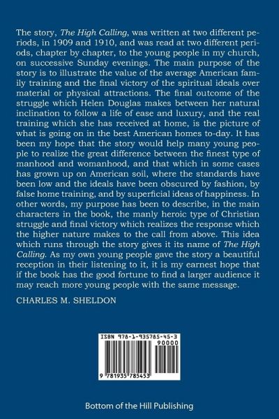 The story, "The High Calling," was written at two different periods, in 1909 and 1910, and was read at two different periods, chapter by chapter, to the young people in my church, on successive Sunday evenings. The main purpose of the story is to illustrate the value of the average American family training and the final victory of the spiritual ideals over material or physical attractions. The final outcome of the struggle which Helen Douglas makes between her natural inclination to follow a life of ease and luxury, and the real training which she has received at home, is the picture of what is going on in the best American homes to-day. It has been my hope that the story would help many young people to realize the great difference between the finest type of manhood and womanhood, and that which in some cases has grown up on American soil, where the standards have been low and the ideals have been obscured by fashion, by false home training, and by superficial ideas of happiness. In other words, my purpose has been to describe, in the main characters in the book, the manly heroic type of Christian struggle and final victory which realizes the response which the higher nature makes to the call from above. This idea which runs through the story gives it its name of "The High Calling." As my own young people gave the story a beautiful reception in their listening to it, it is my earnest hope that if the book has the good fortune to find a larger audience it may reach more young people with the same message. --CHARLES M. SHELDON.
