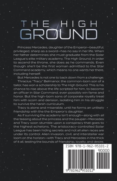 Princess Mercedes, daughter of the Emperor-beautiful, privileged, sharp as a sword-has no say in her life. When her father determines she must graduate from the Solar League's elite military academy, The High Ground, in order to ascend the throne, she does as he commands. Even though she'll be the first woman admitted to the Star Command academy, which means no one wants her there, including herself. But Mercedes is not one to back down from a challenge. Thracius "Tracy" Belmanor, the common-born son of a tailor, has won a scholarship to The High Ground. This is his chance to rise above the life scripted for him, to become an officer in Star Command, even possibly win fame and honor. But the high-born sons of corporate royalty treat him with scorn and derision, isolating him in his struggle to survive the harsh curriculum. Tracy is alone and miserable, until he forms an unlikely friendship with the the Emperor's daughter. As if surviving the academy isn't enough-along with all the teasing about the princess and the pauper-Mercedes and Tracy soon stumble upon a conspiracy that goes to the highest echelons. The aristocracy-controlled Solar League has been hiding secrets and not all alien races are under its control. Alien invasion, civil, and interstellar war loom on the horizon-with Tracy and Mercedes in the thick of it all, testing the bounds of friendship, loyalty, and desire.
