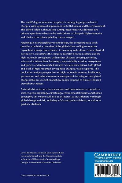 This edited volume, showcasing cutting-edge research, addresses two primary questions - what are the main drivers of change in high-mountains and what are the risks implied by these changes? From a physical perspective, it examines the complex interplay between climate and the high-mountain cryosphere, with further chapters covering tectonics, volcano-ice interactions, hydrology, slope stability, erosion, ecosystems, and glacier- and snow-related hazards. Societal dimensions, both global and local, of high-mountain cryospheric change are also explored. The book offers unique perspectives on high-mountain cultures, livelihoods, governance and natural resources management, focusing on how global change influences societies and how people respond to climate-induced cryospheric changes. An invaluable reference for researchers and professionals in cryospheric science, geomorphology, climatology, environmental studies and human geography, this volume will also be of interest to practitioners working in global change and risk, including NGOs and policy advisors.
