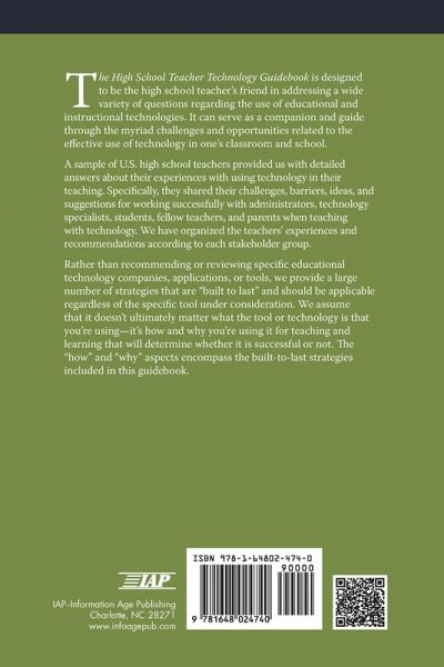 This guidebook is designed to be the high school teacher's friend in addressing a wide variety of questions regarding the use of educational and instructional technologies. It can serve as a companion and guide through the myriad challenges and opportunities related to the effective use of technology in one's classroom and school. A sample of U.S. high school teachers provided us with detailed answers about their experiences with using technology in their teaching. Specifically, they shared their challenges, barriers, ideas, and suggestions for working successfully with administrators, technology specialists, students, fellow teachers, and parents when teaching with technology. We have organized the teachers' experiences and recommendations according to each stakeholder group. Rather than recommending or reviewing specific educational technology companies, applications, or tools, we provide a large number of strategies that are "built to last" and should be applicable regardless of the specific tool under consideration. We assume that it doesn't ultimately matter what the tool or technology is that you're using-it's how and why you're using it for teaching and learning that will determine whether it is successful or not. The "how" and "why" aspects encompass the built-to-last strategies included in this guidebook.
