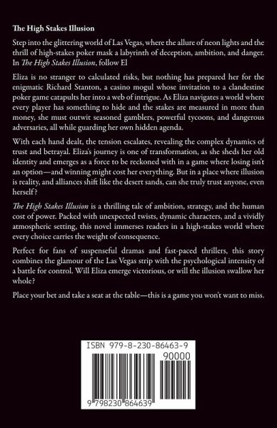 The High Stakes Illusion Step into the glittering world of Las Vegas, where the allure of neon lights and the thrill of high-stakes poker mask a labyrinth of deception, ambition, and danger. In The High Stakes Illusion, follow El Eliza is no stranger to calculated risks, but nothing has prepared her for the enigmatic Richard Stanton, a casino mogul whose invitation to a clandestine poker game catapults her into a web of intrigue. As Eliza navigates a world where every player has something to hide and the stakes are measured in more than money, she must outwit seasoned gamblers, powerful tycoons, and dangerous adversaries, all while guarding her own hidden agenda. With each hand dealt, the tension escalates, revealing the complex dynamics of trust and betrayal. Eliza's journey is one of transformation, as she sheds her old identity and emerges as a force to be reckoned with in a game where losing isn't an option-and winning might cost her everything. But in a place where illusion is reality, and alliances shift like the desert sands, can she truly trust anyone, even herself? The High Stakes Illusion is a thrilling tale of ambition, strategy, and the human cost of power. Packed with unexpected twists, dynamic characters, and a vividly atmospheric setting, this novel immerses readers in a high-stakes world where every choice carries the weight of consequence. Perfect for fans of suspenseful dramas and fast-paced thrillers, this story combines the glamour of the Las Vegas strip with the psychological intensity of a battle for control. Will Eliza emerge victorious, or will the illusion swallow her whole? Place your bet and take a seat at the table-this is a game you won't want to miss.