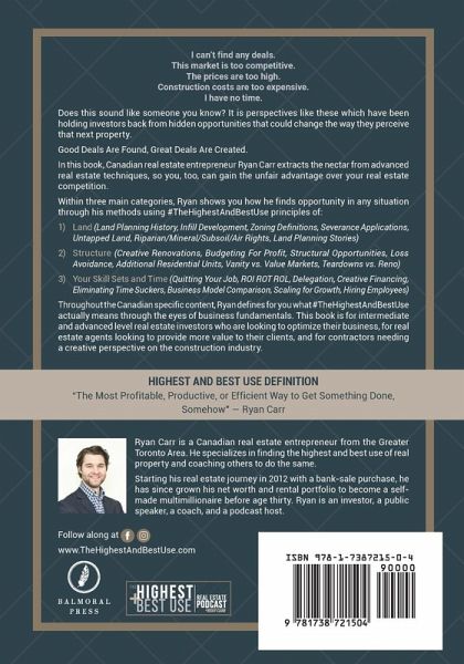 I can't find any deals. This market is too competitive. The prices are too high. Construction costs are too expensive. I have no time. Does this sound like someone you know? It is perspectives like these which have been holding investors back from hidden opportunities that could change the way they perceive that next property. Good Deals Are Found, Great Deals Are Created. In this book, Canadian real estate entrepreneur Ryan Carr extracts the nectar from advanced real estate techniques, so you, too, can gain the unfair advantage over your real estate competition. Within three main categories, Ryan shows you how he finds opportunity in any situation through his methods using #TheHighestAndBestUse principles of: 1) Land (Land Planning History, Infill Development, Zoning Definitions, Severance Applications, Untapped Land, Riparian/Mineral/Subsoil/Air Rights, Land Planning Stories) 2) Structure (Creative Renovations, Budgeting For Profit, Structural Opportunities, Loss Avoidance, Additional Residential Units, Vanity vs. Value Markets, Teardowns vs. Reno) 3) Your Skill Sets and Time (Quitting Your Job, ROI ROT ROL, Delegation, Creative Financing, Eliminating Time Suckers, Business Model Comparison, Scaling for Growth, Hiring Employees) Throughout the Canadian specific content, Ryan defines for you what #TheHighestAndBestUse actually means through the eyes of business fundamentals. This book is for intermediate and advanced level real estate investors who are looking to optimize their business, for real estate agents looking to provide more value to their clients, and for contractors needing a creative perspective on the construction industry. As much as this book is about real estate, at its core it is a business book where bricks, sticks, dirt, and entrepreneurial tendencies bind together. HIGHEST AND BEST USE DEFINITION"The Most Profitable, Productive, or Efficient Way to Get Something Done,Somehow" - Ryan Carr