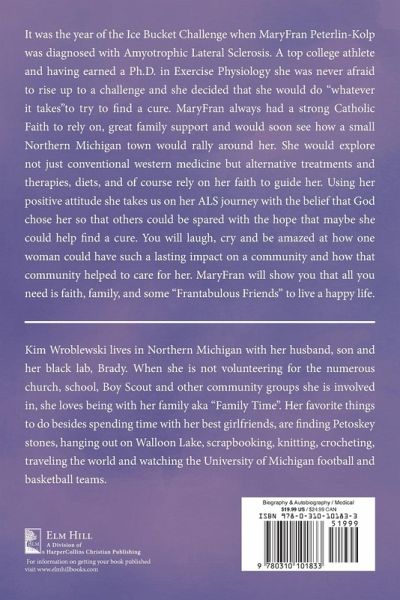 It was year of the Ice Bucket Challenge when MaryFran Peterlin-Kolp was diagnosed with Amyotrophic Lateral Sclerosis. A top college athlete and having earned a Ph. D in Exercise Physiology she was never afraid to rise up to a challenge and she decided that she would do "whatever it takes" to try to find a cure. MaryFran always had a strong Catholic Faith to rely on, great family support and would soon see how a small Northern Michigan town would rally around her. She would explore not just conventional western medicine but alternative treatments and therapies, diets, and of course rely on her faith to guide her. Using her positive attitude she takes us on her ALS journey with the belief that God chose her so that others could be spared with the hope that maybe she could help find a cure. You will laugh, cry and be amazed at how one woman could have such a lasting impact on a community and how that community helped to care for her. MaryFan will show you that all you need is faith, family, and some "Frantabulous Friends" to live a happy life.
