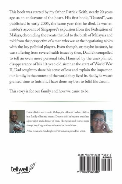 This book was started by my father, Patrick Keith, nearly 20 years ago as an endeavour of the heart. His first book, "Ousted", was published in early 2005, the same year that he died. It was an insider's account of Singapore's expulsion from the Federation of Malaya, chronicling the events that led to the birth of Malaysia and told from the perspective of a man who was at the negotiating tables with the key political players. Even though, or maybe because, he was suffering from severe health issues by then, Dad felt compelled to tell an even more personal tale. Haunted by the unexplained disappearance of his 10-year-old sister at the start of World War II, Dad sought to share his sense of loss and explain the impact on our family, in the context of the world they lived in. Sadly, he wasn't granted time to finish it. I have done my best to fulfil his dream. This story is for our family and how we came to be.