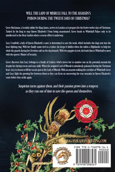 Will the Lady of Misrule fall to the assassin's poison during the twelve days of Christmas? Greer Buchanan, a Scottish soldier for King James, arrives in London as it prepares for the festive twelve days of Christmas. Tasked by his king to stop Queen Elizabeth I from being assassinated, Greer heads to Whitehall Palace only to be misdirected to the Bear Garden where a rescue effort is underway. Lucy Cranfield, a lady of Queen Elizabeth's court, is determined to save the weak, which includes the dogs sent into the bear fighting ring. With her family name tied to a traitor, she keeps it hidden when she enlists a Highlander to help her elude the guards during her freedom raid on the dog kennels. With two puppies in tow, she leads him to Whitehall to meet with the queen's Master of Security. Greer discovers that Lucy belongs to a family of traitors, which moves her to number one on his potential assassin list despite her daring rescue and easy smile. When the assigned Lord of Misrule is mistakenly poisoned during the Christmas feast, Lucy is chosen to fill his vacant spot as the Lady of Misrule. With an assassin walking the corridors of Whitehall, Greer and Lucy fight the growing fire between them so they can focus on uncovering the true assassins in Queen Elizabeth's court before they strike again. Suspicion turns against them, and their passion grows into a tempest, as they run out of time to save the queen and themselves. The Queen's Highlanders The Highlander & The Queen's Sacrifice The Highlander & the Lady of Misrule The Highlander & the Counterfeit Queen