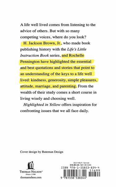 A life well lived comes from listening to the advice of others. But with so many competing voices, where do you look? When a student wants to remember the most important parts of a text in school, he highlights them in yellow. Those highlighted words are the ones that must be reviewed carefully to understand the subject and pass the test. H. Jackson Brown, Jr., with sales of more than 27 million books in the past decade, and Rochelle Pennington have highlighted the essential and best quotations and stories that point to an understanding of the elements that are key to a life well lived: kindness, attitude, generosity, character, simple pleasures, and dreams. From the wealth of their study comes a short course in living wisely and choosing well. Highlighted in Yellow offers inspiration for confronting issues that we all face daily.